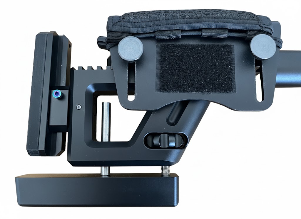 – La crosse est équipée d’un bag rider en Delrin réglable en hauteur et d’une surface d’appui au sol inférieur au 9cm² (maxi autorisé dans la plupart des compétitions de TLD), ce bag rider si il est retiré laisse l’accès au montage d’un rail picatinny (entraxe de 40mm) qui permet le montage de tout monopod du commerce